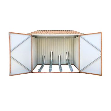 Gemacht, um Ihre Fahrräder zu lagern, ideal, wenn Sie zum Beispiel Elektrofahrräder haben. Leicht zugängliche Fahrradschuppen, in die Sie Ihre Fahrräder schieben können. Sie können zwischen Fahrradschuppen aus Holz und Metall wählen. Sie können auch aus verschiedenen Materialien wählen, aus denen unsere Gerätehäuser bestehen: